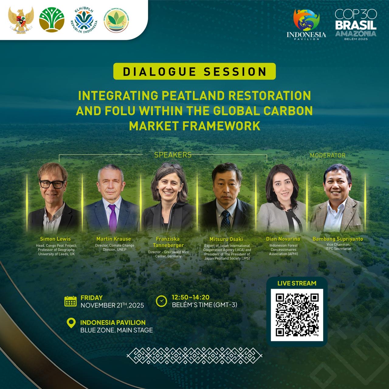 The primary objective of this session is to discuss and exchange perspectives on tropical peatland restoration and the global carbon market. The session will present Indonesia’s Forestry and Other Land Use (FOLU) implementation as a carbon market mechanism, while also exploring other approaches adopted in tropical peatland countries such as Peru, the Democratic Republic of the Congo (DRC), and the Republic of the Congo (RoC). This will create valuable opportunities for cross-country knowledge exchange and international collaboration.
